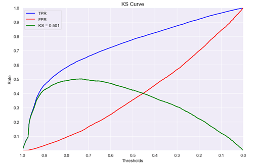 KS与ROC的计算差不多,其定义为 \[ KS = |TPR-FPR| \] 其KS曲线趋势为
