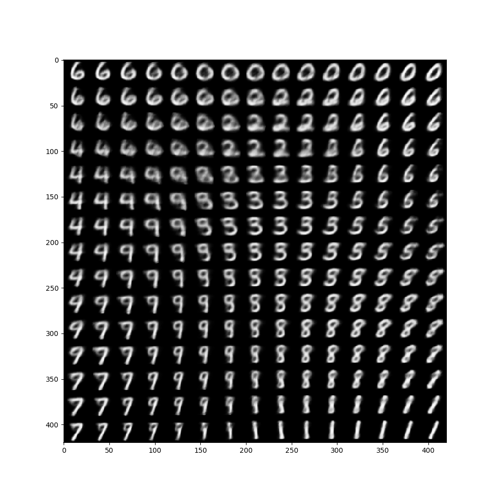 这是一个使用手写数据集作为训练集的生成任务demo。为方便作图,使 \(z\) 服从二元标准正态分布。下图是进行从二元标准正态分布抽取若干个点生成的若干个图像。