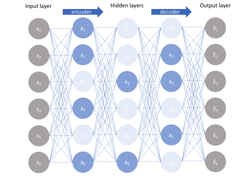 其基本思想是,输入经过一系列变换后,最终的输出和输入相同。简单来说就是输入即输出。模型的函数表达式为 \[ f(x) = x \] 一个经典的AE模型的结构如下
