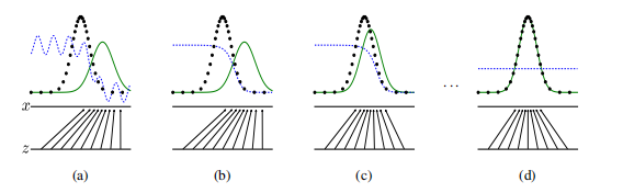 - 黑色虚线表示真实的样本的分布情况,蓝色虚线表示判别器判别概率的分布情况,绿色实线表示生成样本的分布。\(Z \rightarrow x\) 表示从噪声生成数据的过程。