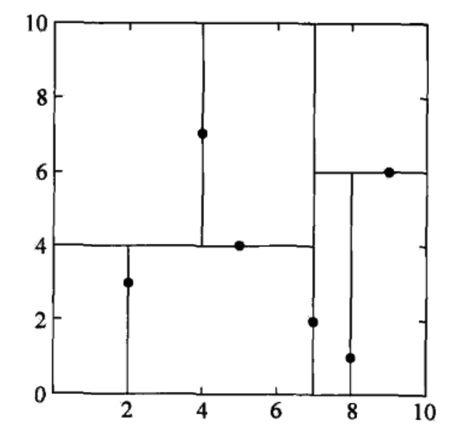 - 选取 \(x_i^{(2)}\) 作为划分坐标轴,分别对左右区域重复步骤1的划分方法
