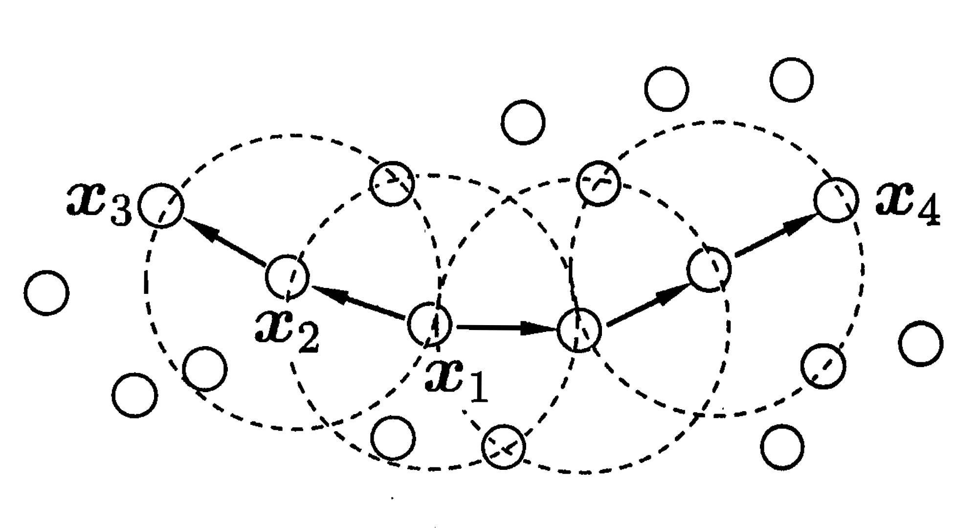 - 密度可达,对 \(x_j\) 和 \(x_i\) ,若存在一系列点 \(p_1,...,p_n\) ,使得 \(p_1=x_i,p_n=x_j\) ,且 \(p_{i+1}\) 由 \(p_i\) 密度直达,则称 \(x_j\) 由 \(x_i\) 密度可达