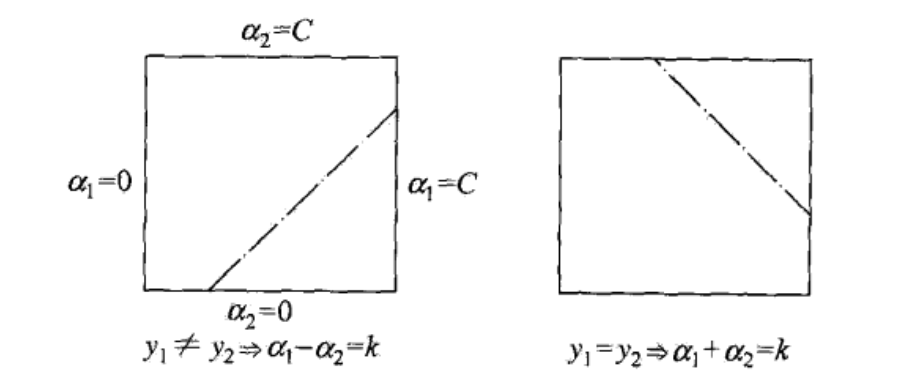假设初始解为 \(\alpha_1^{old},\alpha_2^{old}\),最优解为 \(\alpha_1^{new}, \alpha_2^{new}\),则 \(\alpha_2^{new}\) 的取值范围必须满足下列条件 \[ L \leq \alpha_2^{new} \leq H \] 当 \(y_1 \neq y_2\) 时 \[ L = \max(0, \alpha_2^{old} - \alpha_1^{old}) \\ H = \min (C, C + \alpha_2^{old} - \alpha_1^{old}) \] 当 \(y_1 = y_2\) 时 \[ L = \max(0,\alpha_2^{old}+\alpha_1^{old}-C) \\ H = \min (C, \alpha_2^{old}+\alpha_1^{old}) \]