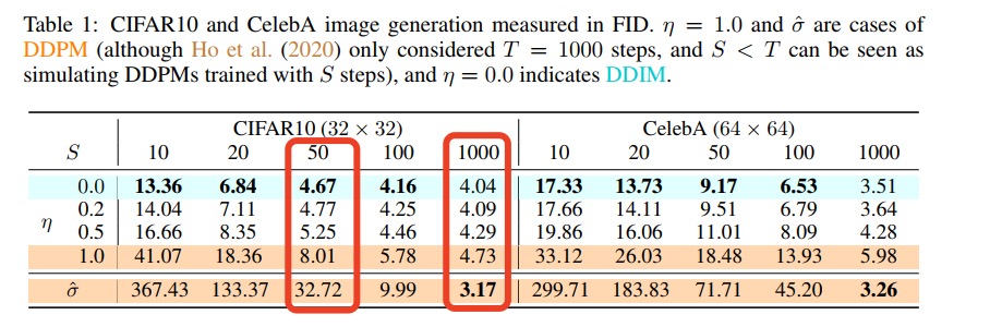 最后,论文中还通过实验发现,在CIFAR10数据集上,仅采样50步,即可达到ddpm中采样1000步的90%的效果。