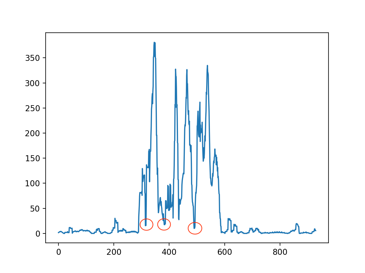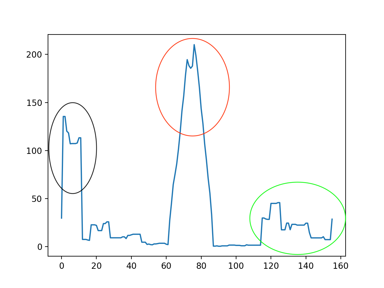 首先,上图中可以划分为3个行块密度较大的区域,直觉告诉我们,这个3个区域应该都分别是一个正文部分(尽管最后的结果表明只有红色部分是正文部分),但由于我们只根据骤起点和骤降点判断,由于曲线起伏较大,存在多个波峰和波谷,会把原本是一个整体的正文部分割裂成多个小段,就会导致中间一些能量较小的段落被忽略掉(如上图中绿色圈的中间部分就很大概率被忽略掉)。
