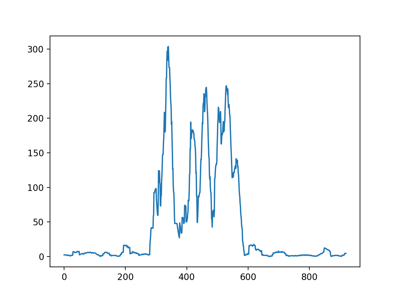 我们设置一个长度为 \(n\) 的平滑窗口,每一行的字数为前后共 \(n\) 行字数之和的均值,即将文章中势能高的部分均摊势能低的部分(有点像word2vec中的词袋模型),平滑后的情况如下